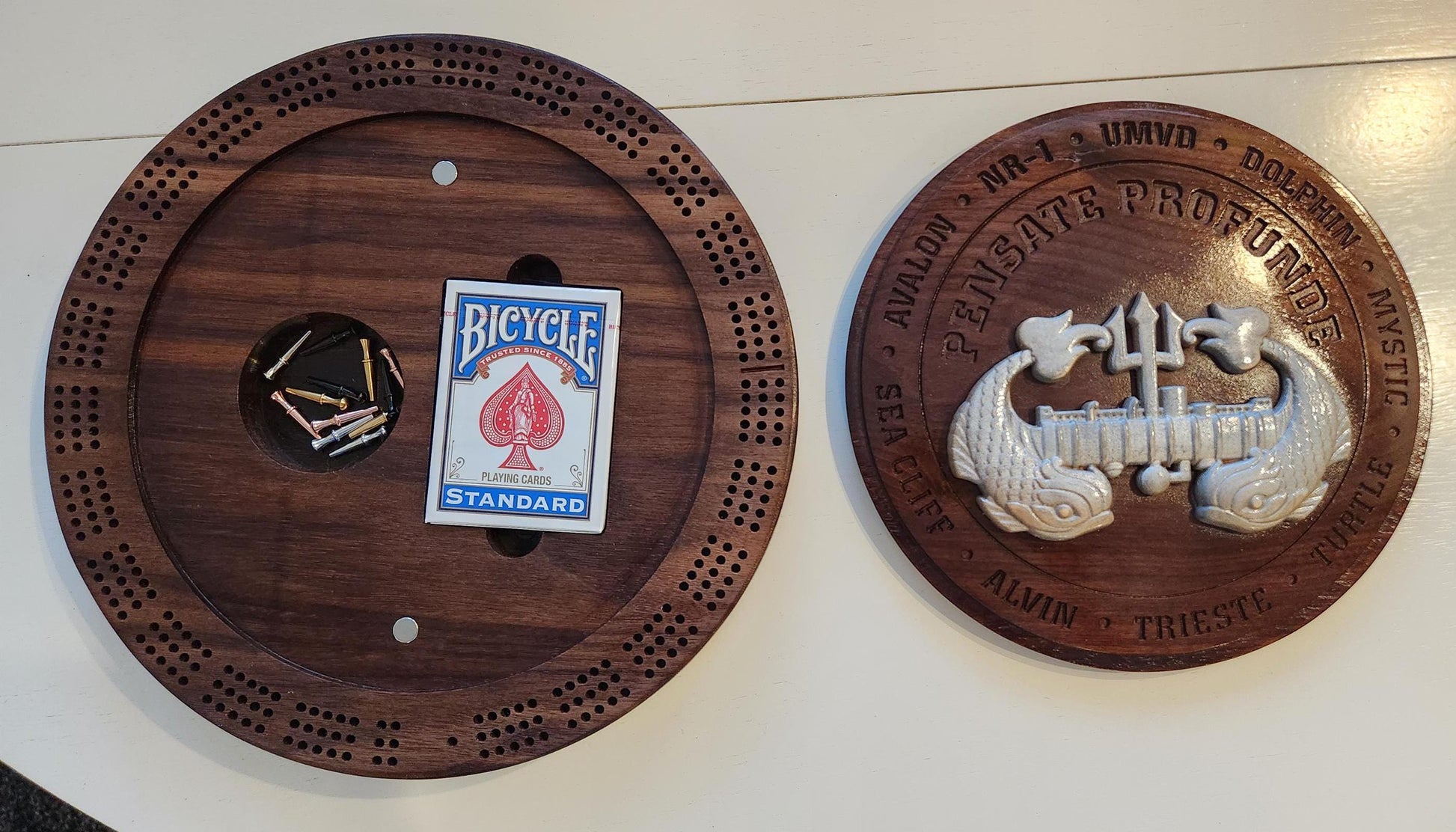 Custom engraved cribbage board with card and peg storage. Board can be made of maple, cherry, or walnut, and oil finished. Pictured in walnut. Base is 11 inches across, and 1-1/4 inches thick. Centerpiece is about 9 inches across and about 1 inch thick at the center Magnets hold the centerpiece in place, and a slot in the back allows the board to be displayed as a wall decoration when not in use. Cards and metal pegs (4 different colors, with 3 pins of each color for a total of 12 pins) are included. Custom engraving is available on the underside of the top centerpiece as shown, and each board is numbered. Deep Submergence emblem is cut from a separate piece of wood and inlayed into the center piece. This emblem can be tinted in gold or silver coloring, with just enough of the underlying wood grain exposed.